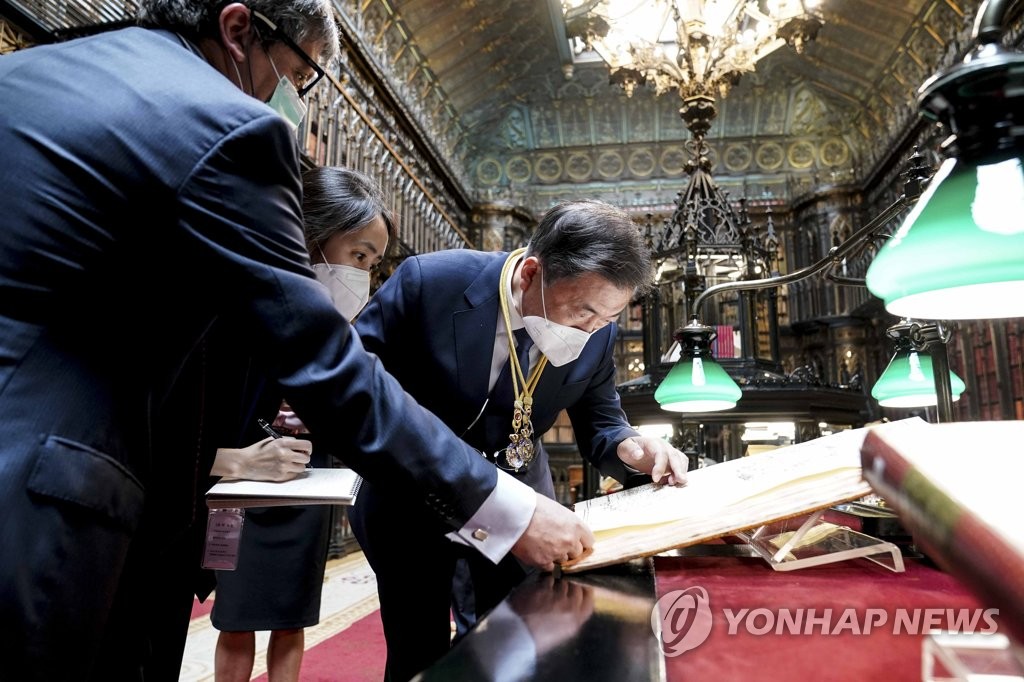 (마드리드[스페인]=연합뉴스) 이진욱 기자 = 스페인을 국빈 방문 중인 문재인 대통령이 16일(현지시간) 스페인 마드리드 상원의사당에서 상·하원 합동 연설을 마친 후 상원 도서관을 방문. 안헬 곤잘레스 도서관장에게 '조선왕국전도'에 대한 설명을 듣고 있다.2021.6.17 cityboy@yna.co.kr